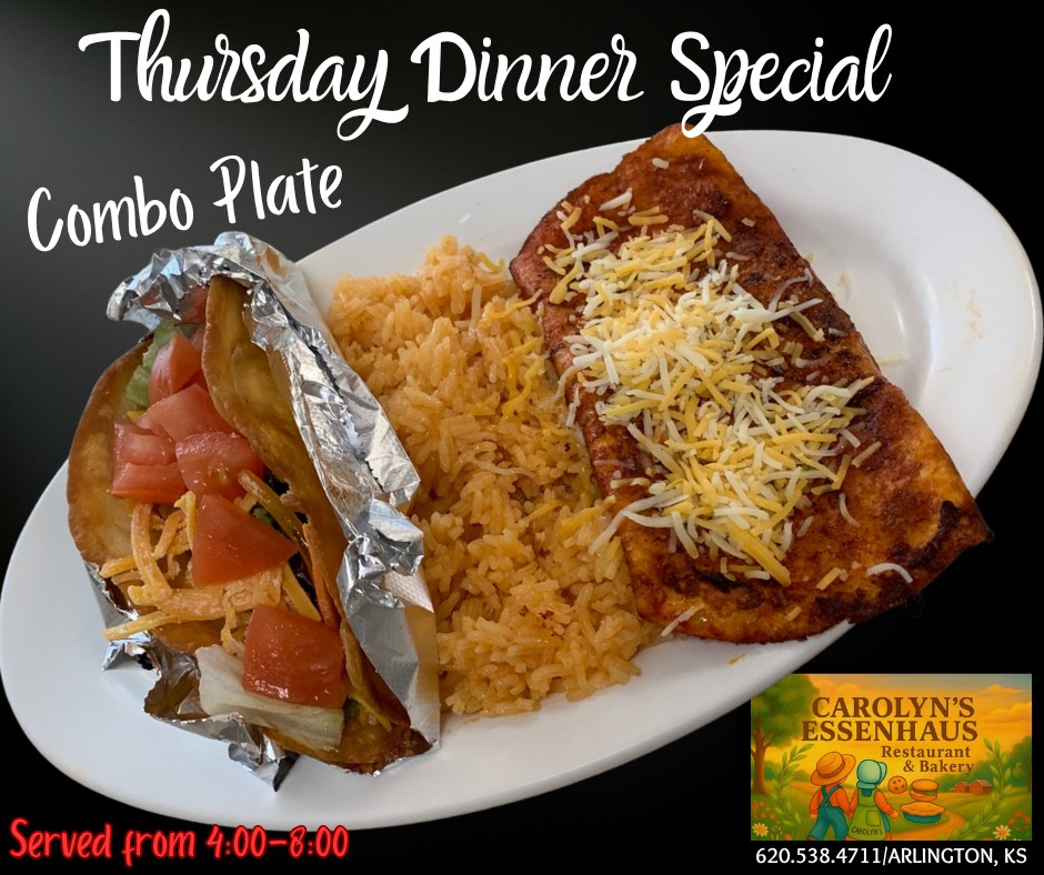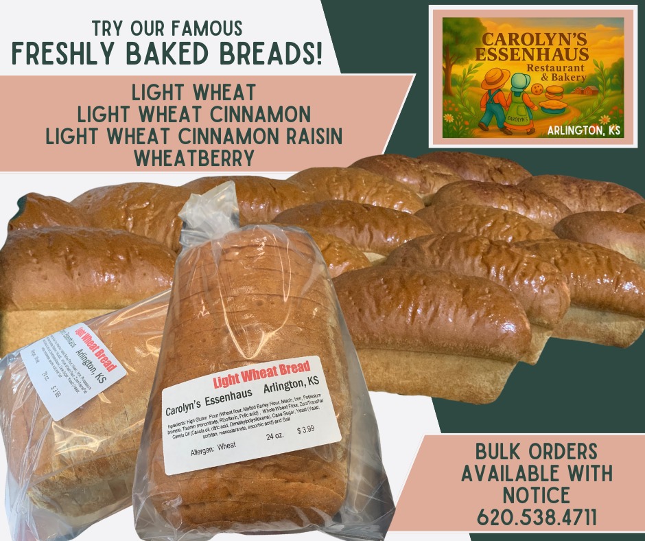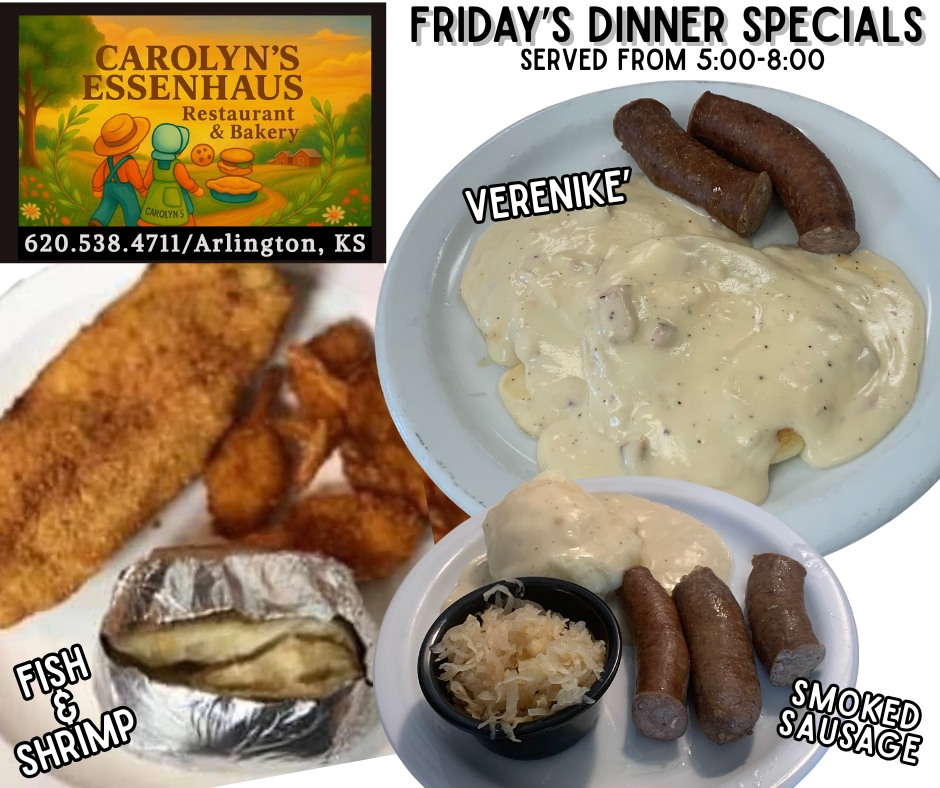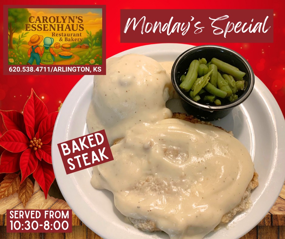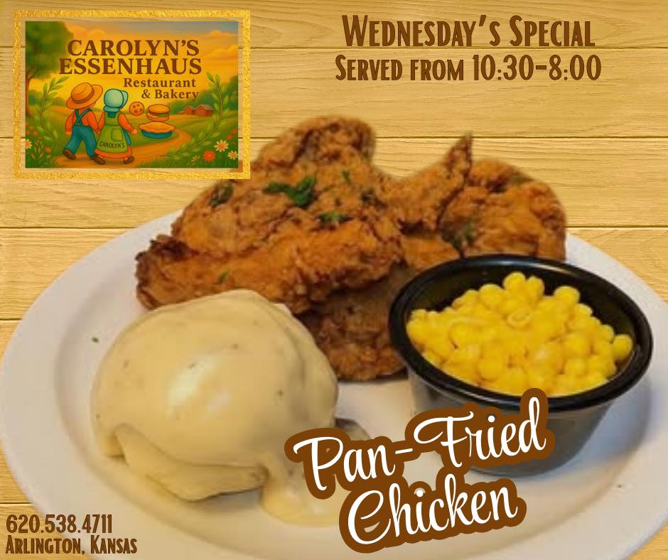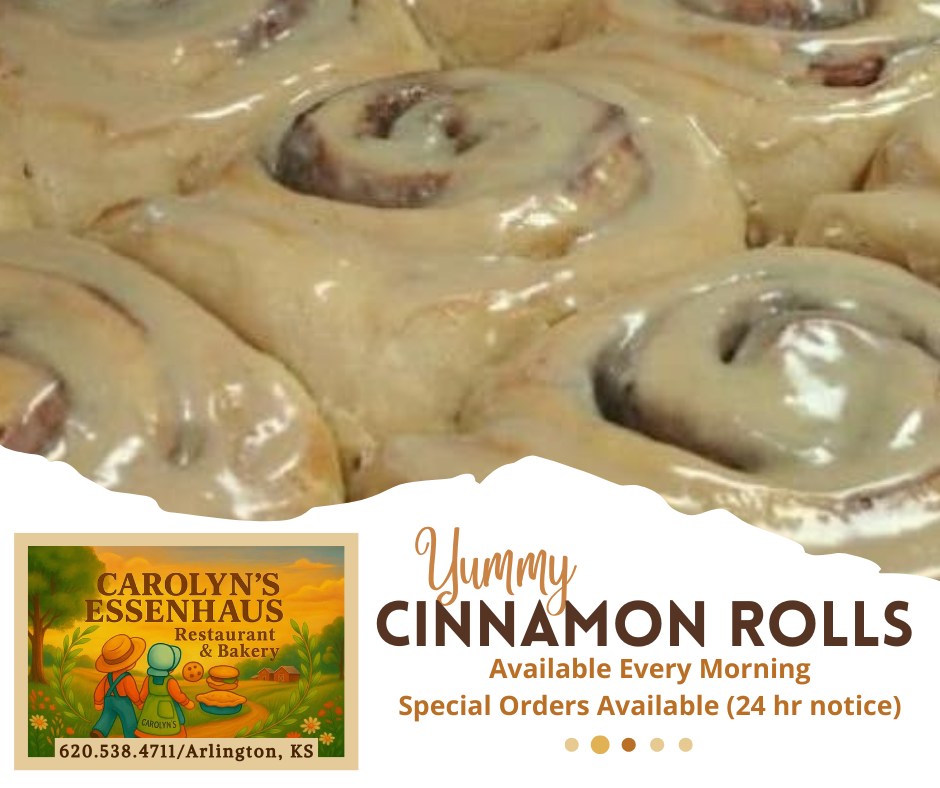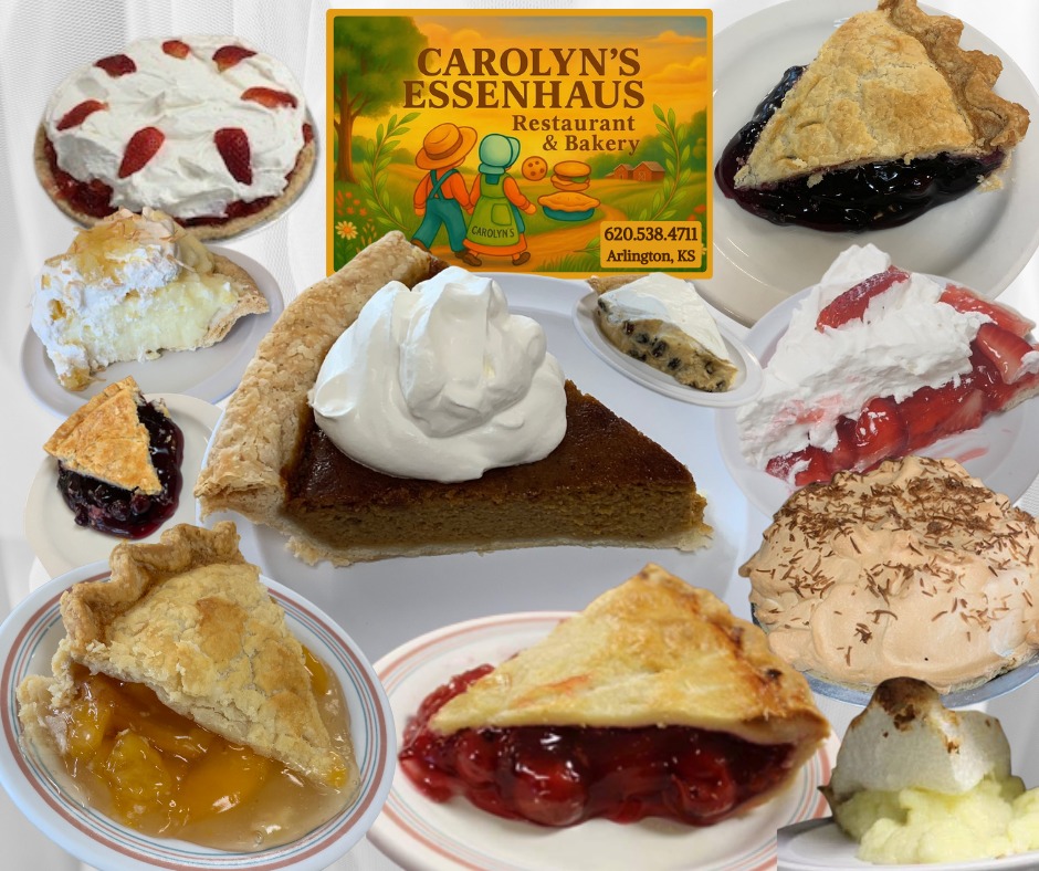 The short drive to Carolyn's Essenhause in Arlington, just west of Hutchinson, is WAY worth your time!! Since 1989, Carolyn's has been serving amazing breakfasts, lunches, or dinners, and...the best homemade pies and cookies you will find anywhere. Oh, the smells, the tastes, and the awesome small-town atmosphere are something you won't find anywhere else! Family-style meals by reservation and don't forget to order those delicious homemade pies and cookies for your backyard BBQs, Birthday Parties, and other fun-filled get-togethers!